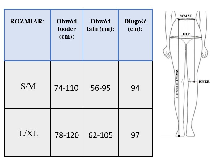 📏 Dostępne w dwóch rozmiarach: S/M (56-95 cm talia, 94 cm długość, 74-110 cm biodra) i L/XL (62-105 cm talia, 97 cm długość, 78-120 cm biodra).