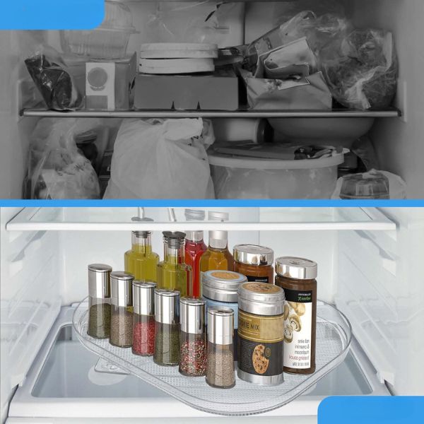Utrzymuj porządek w lodówce dzięki naszej Przezroczystej Prostokątnej Tacce do Lodówki. Ten 360° Obrotowy Organizer do Lodówki idealnie nadaje się do łatwego dostępu i maksymalnego wykorzystania przestrzeni. Jest łatwy w czyszczeniu, ma antypoślizgowe przyssawki i nie wymaga montażu.