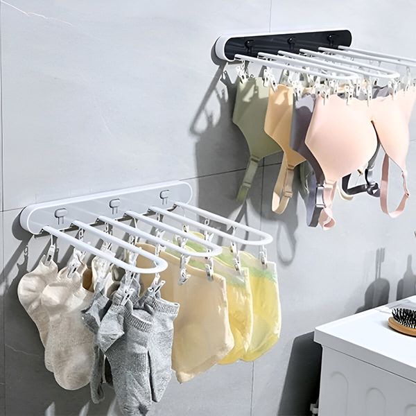 Suszarka jest rozkładana, aby wysuszyć wiele rzeczy, a po użyciu można ją złożyć na płasko przy ścianie, utrzymując porządek i przestrzeń.