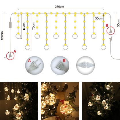 Piękna kurtyna ze świecących bombek ze świątecznymi motywami.
