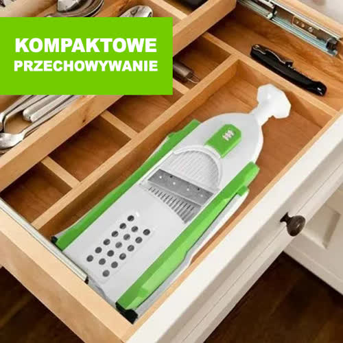 Składana konstrukcja pozwala zaoszczędzić miejsce, dzięki czemu idealnie nadaje się do każdej kuchni. Pozwala także szybko i bezpiecznie przygotować owoce i warzywa w różnych kształtach!
